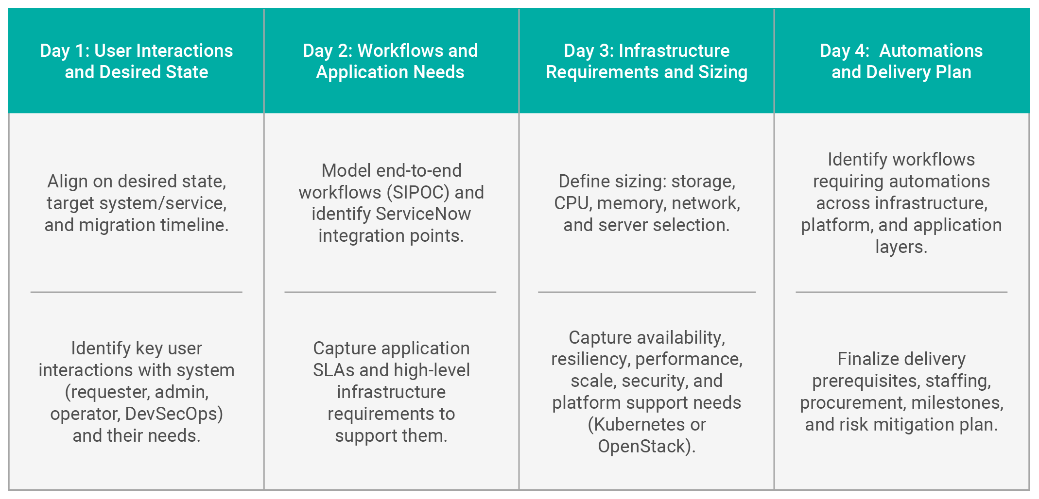 A four-day onsite discovery engagement with industry-leading Wind River experts to define and accelerate your ServiceNow-enabled cloud journey.